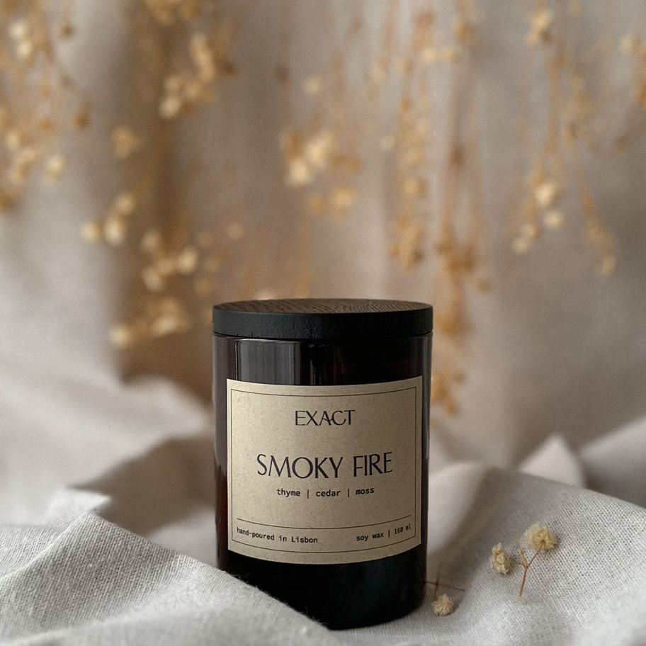 A smoky, bonfire-inspired scent [thyme / cedar / moss].